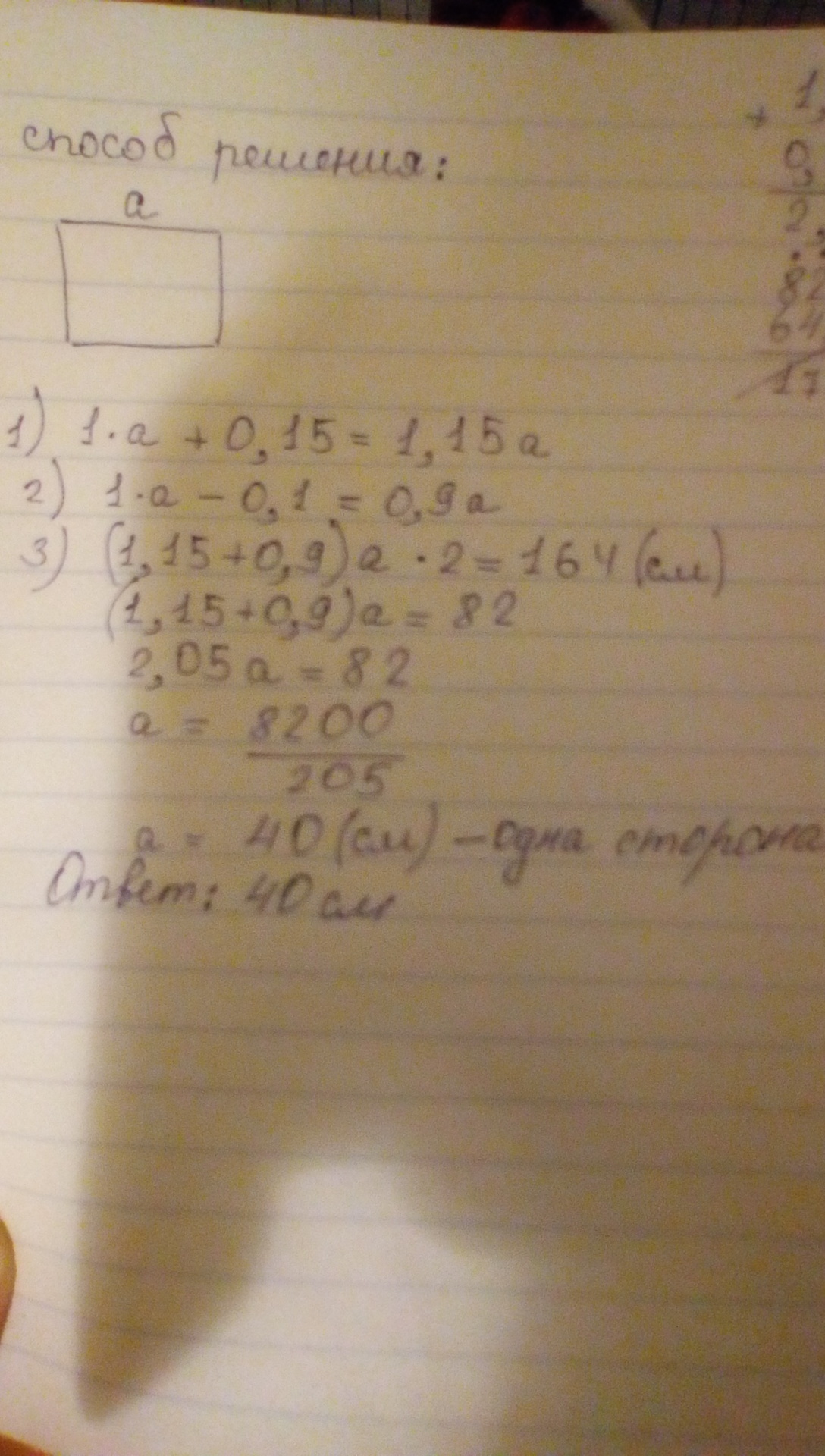 Две противолежащие стороны квадрата увеличили на 15% , а две другие стороны уменьшили на 10% . В результате получается прямоугольник с периметром 164 сантиметров . Найди сторону квадрата .