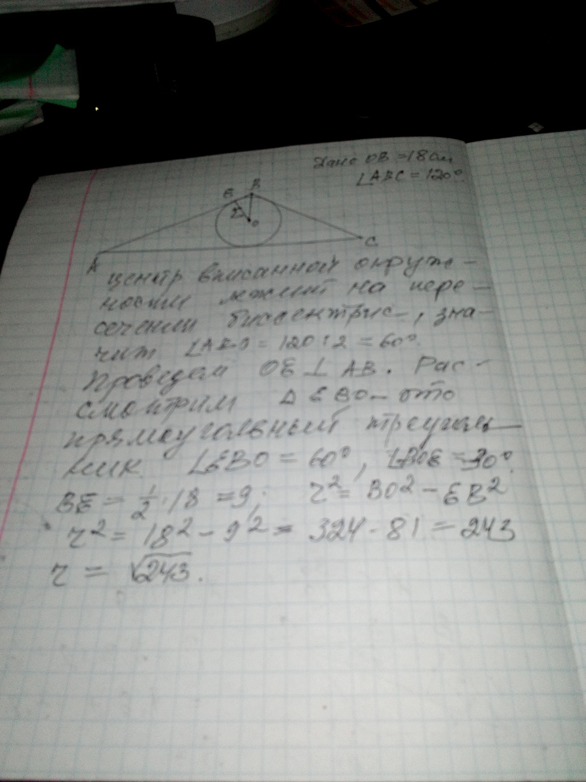 Решение см. на фото.Центр вписанной окружности лежит на пересечении биссектрис треугольника, значит угол 120 градусов делится пополам: 60 градусов, остальное на фото