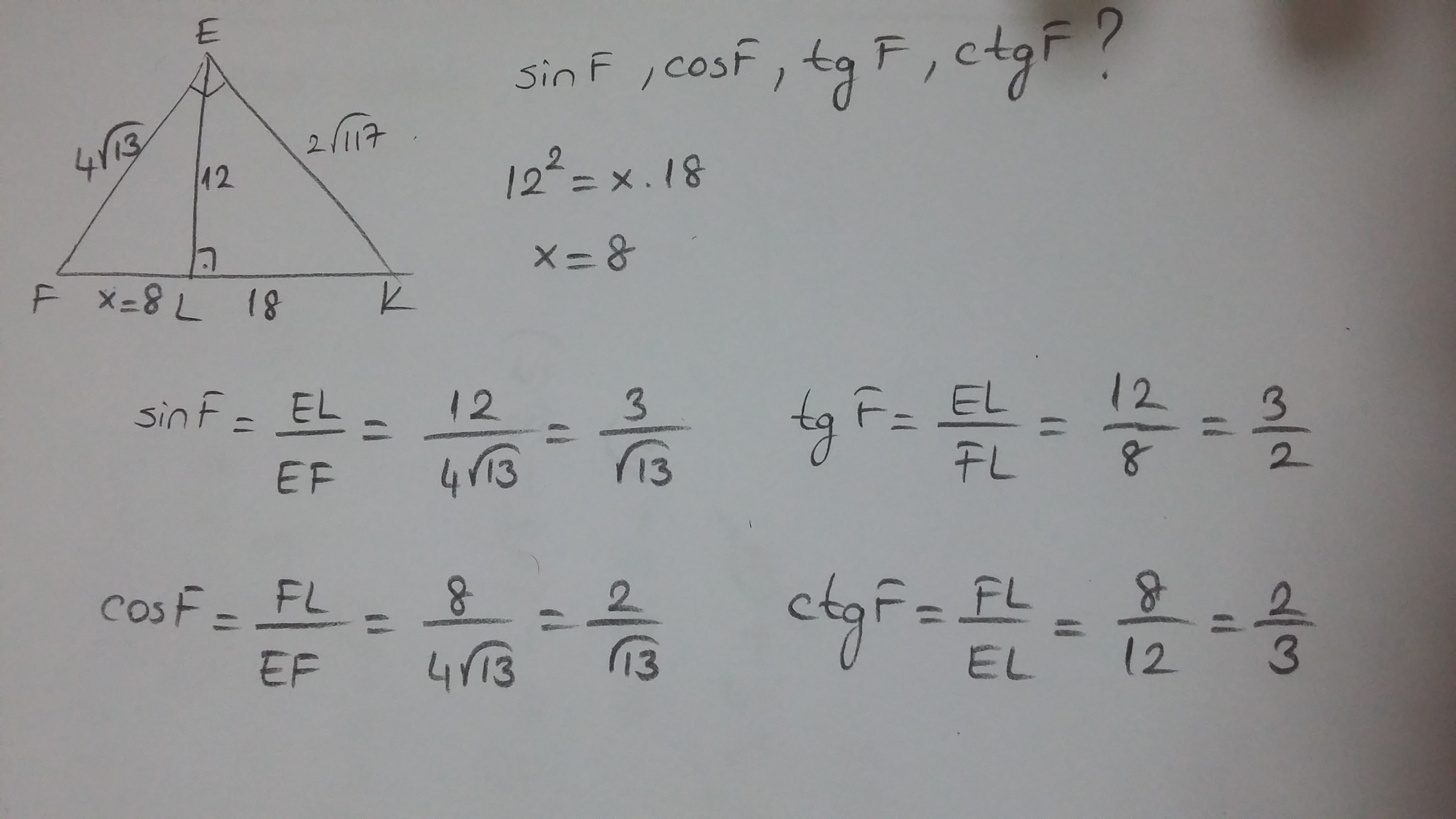 Найдите: sin угла F-?; cos угла F-?; tg угла F-?; ctg угла F-?
