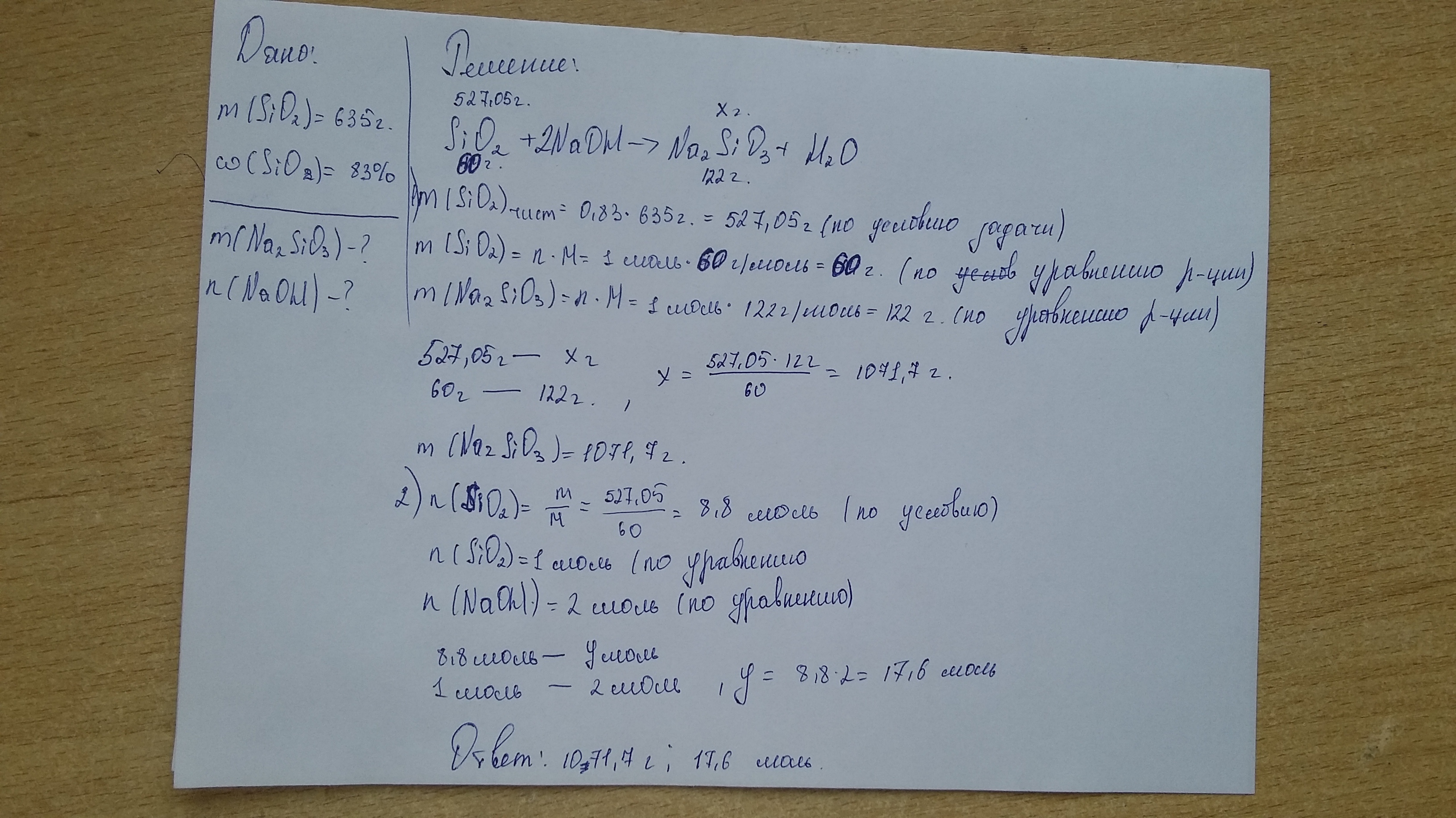 5. Определить массу соли, которая получится при взаимодействии 635 граммов природного песка, содержащего 83% оксида кремния, с гидроксидом натрия. Какое количество щелочи на это понадобится?