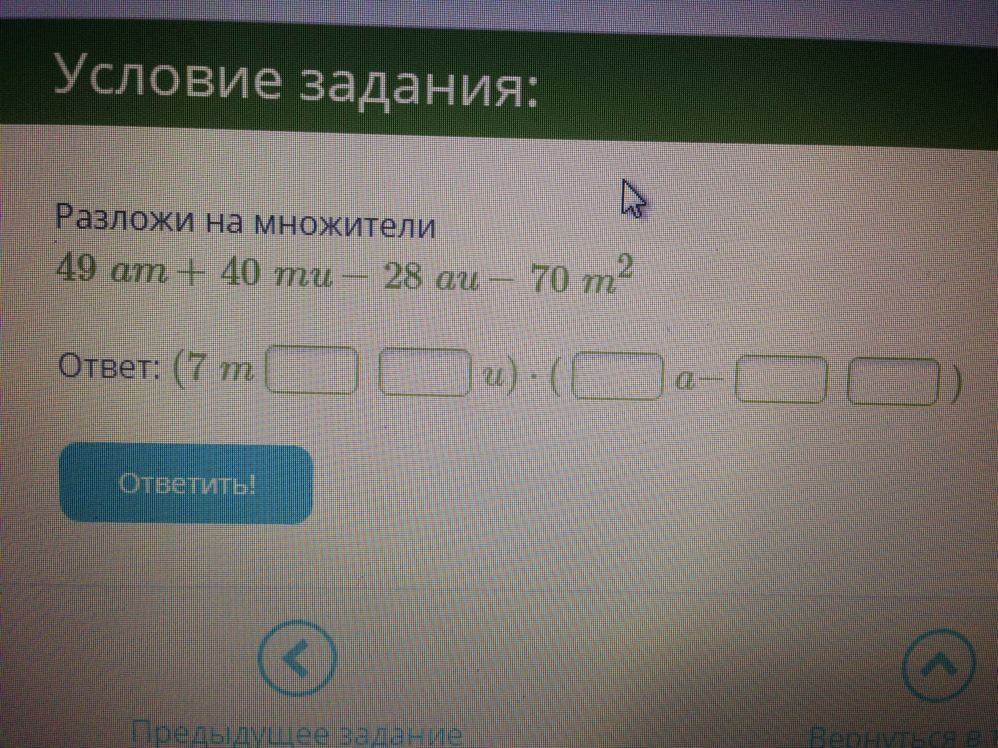 (49аm-28au)+(40mu-70m²)=7a(7m-4u)+10m(4u-7m)=7a(7m-4u)-10m(7m-4u)= (7m-4u)(7a-10m)