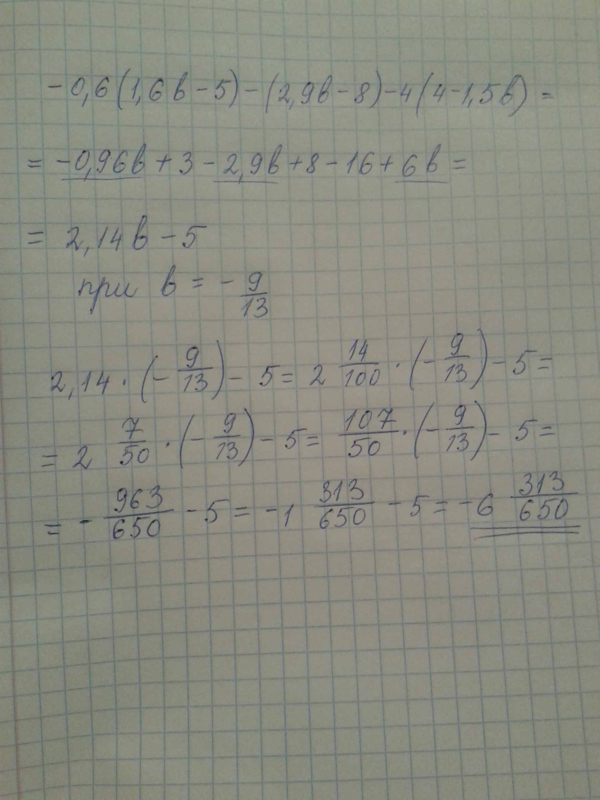 Упростите выражение -0,6(1,6b-5)-(2,9b-8)-4(4-1,5b) и вычислите его значение при b=-9/13