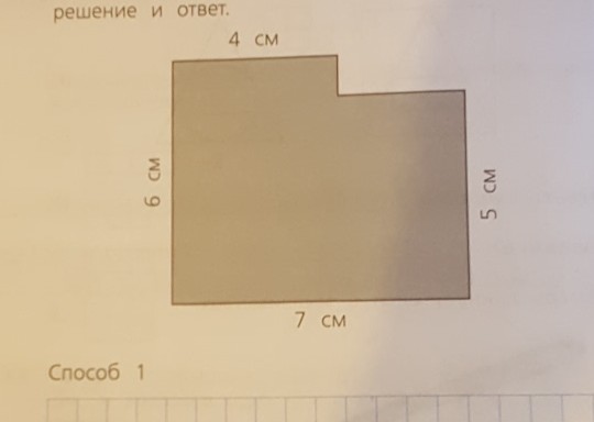 найди площадь этой фигуры двумя способами. Запиши решение и ответ. стороны 4см, 5см, 7см, 6см. Помогите пожалуйста!!!!