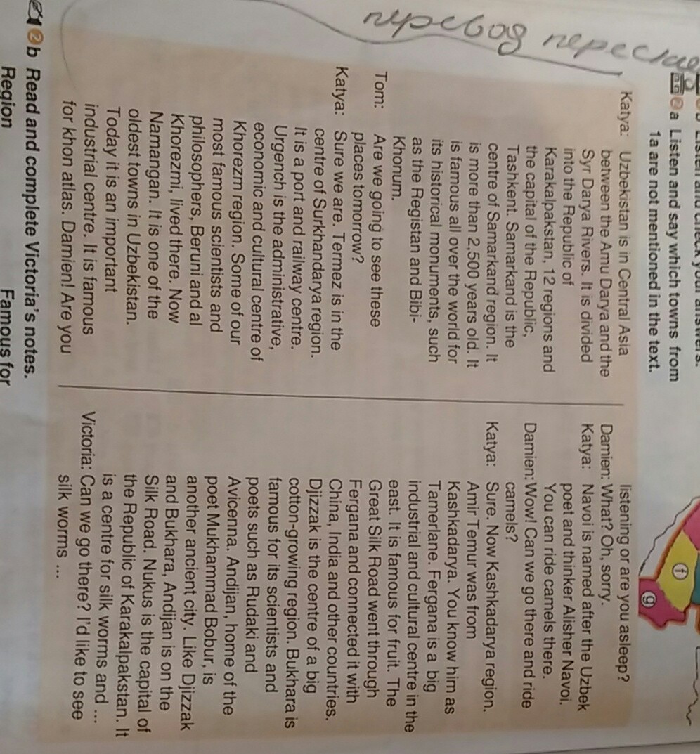 Узбекистан находится в Центральной Азии или вы спите? Между Аму-Дарьей и Дамиеном: Что? Ой, извини. Сырдарья. Разделена Катя: Навои назван в честь узбекского поэта и мыслителя Алишера Навои. O Республика Каракалпакстан, 12 регионов и Вы можете кататься там на верблюдах. Столица Республики, Дэмиен Вау. Мы можем поехать туда и поехать в Ташкент, в Самарканд - верблюды? Центр Самаркандской области. Это Катя: Конечно. Сейчас Кашкадарьинской области более 2500 лет. Именно от Амира Темура он был известен во всем мире для Кашкадарьи. Вы знаете его как его исторические памятники, такие как Тамерлан. Фергана большая, как Регистан и Биби-индустриальный и культурный центр на востоке. Он славится фруктами. Том: Мы увидим, что завтра эти Великий Шелковый Путь прошли через места? Фергану и связал ее с Катей: Конечно, мы такие. Термез находится в центре Китая, Индии и других стран Сурхандарьинского региона. Джизак - центр крупного порта и железнодорожного вокзала. Хлопководческого региона. Бухара - Ургенч - адринистра, известная своими учеными и экономическим и культурным центром поэтов, таких как Рудаки и Хорезмская область. Некоторые из наших Авиценн. Андижан, дом самых известных ученых и поэта Мухаммада Бобура, - это философы, Беруни и другие древние города. Как Хорезми, там жили. Сейчас и Бухара, Андижан находится на Намангане. Это один из Великих шелковых путей. Нукус - столица древнейших городов Узбекистана. Республика Каракалпакстан. Сегодня это важный центр для шелковых червей и промышленного центра. Это знаменитая Виктория: мы можем пойти туда? Я бы хотел увидеть атлас хона. Дамиан! Вы - шелковые черви 210b Прочитайте и заполните заметки Виктории. Область