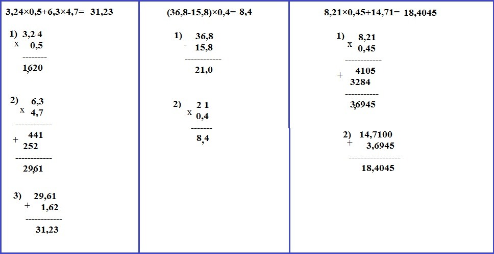 Решите примеры в столбик по действиям1) 3,24×0,5+6,3×4,7= 2) (36,8-15,8)×0,4= 3) 8,21×0,45+14,71=