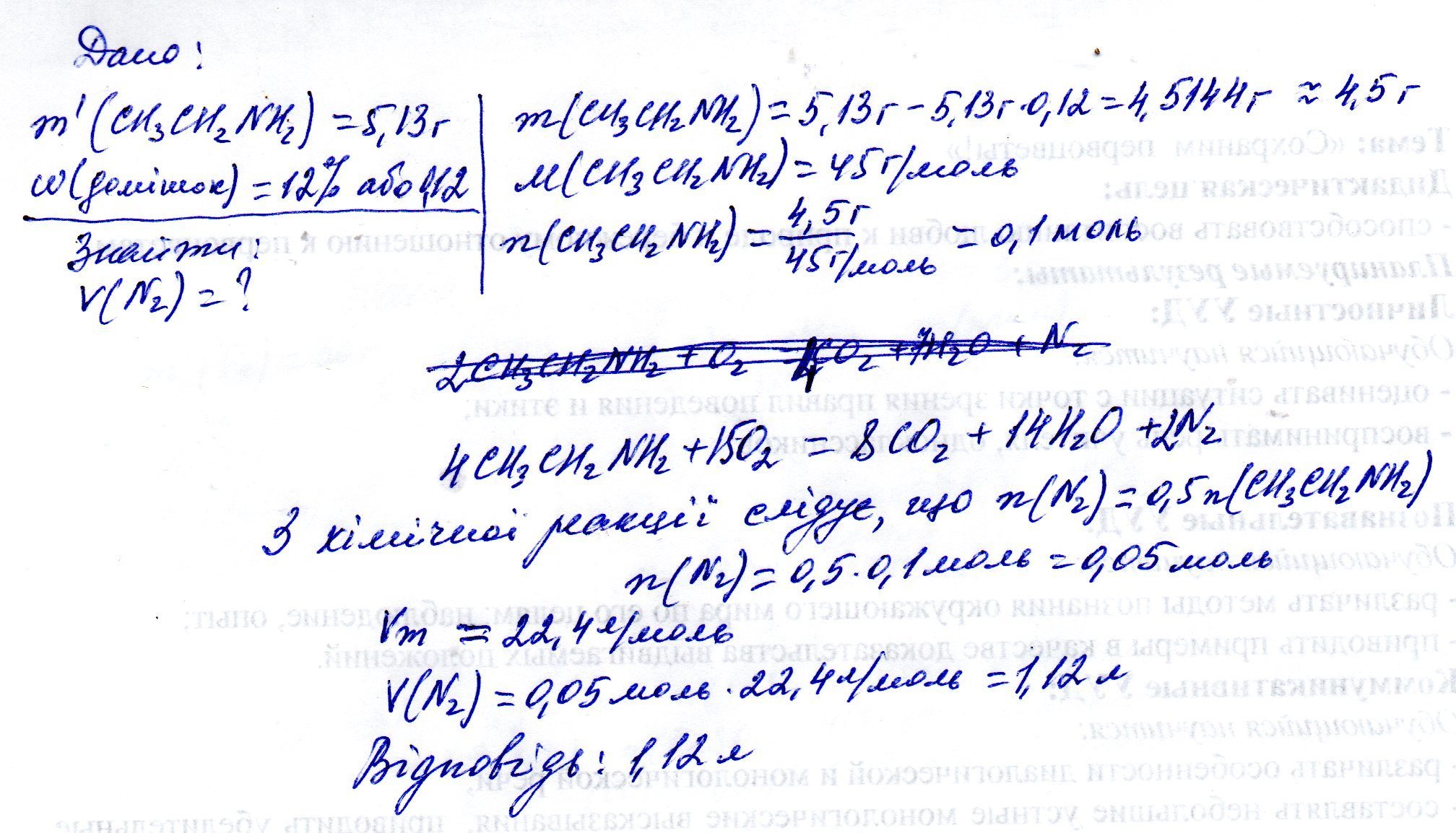 2. Обчисліть об’єм азоту (н. у.), що утвориться в результаті згоряння 5,13 г етиламіну, який містить 12 % негорючих домішок.