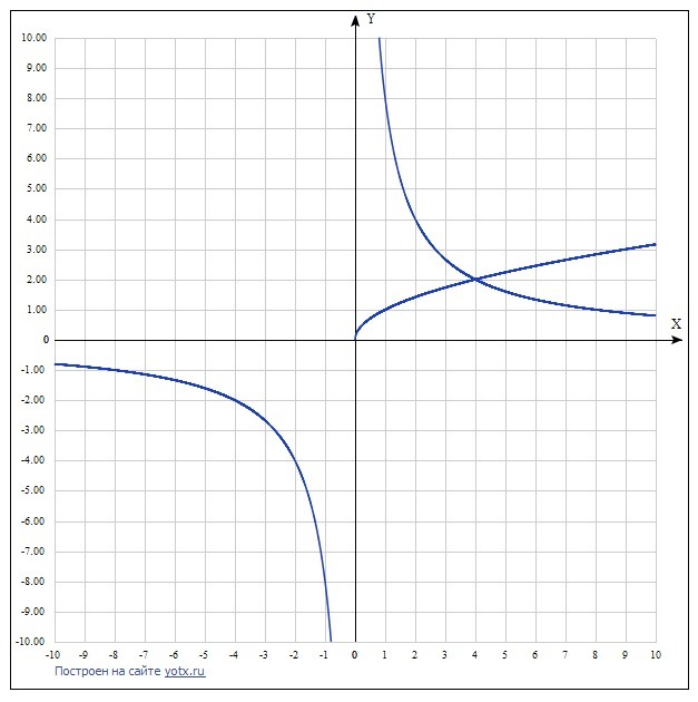 Найдите сумму координат точки пересечения графиков функций y=корень x и y=8/x