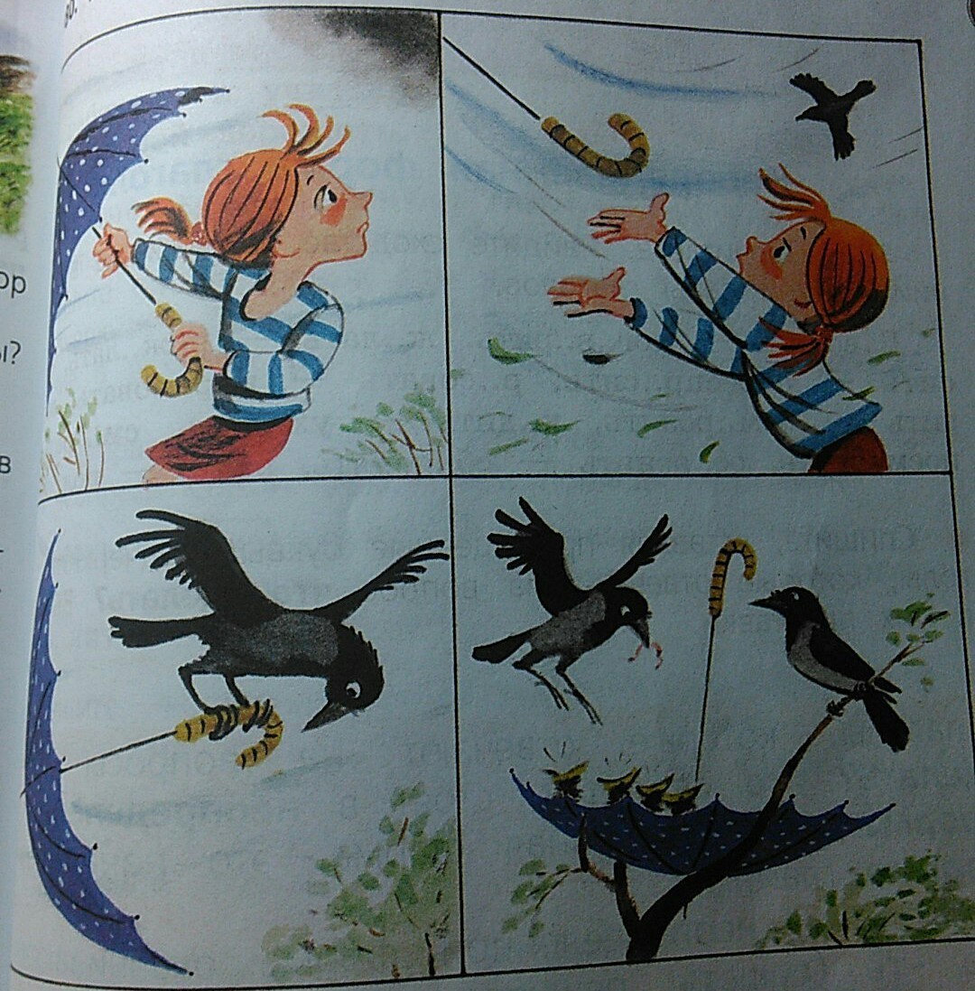 Был сильный ветер, Рита шла домой с зонтом. Вдруг зонт вырвался. В небе его подхватил ворон, чтобы сделать дом для своих птенцов.