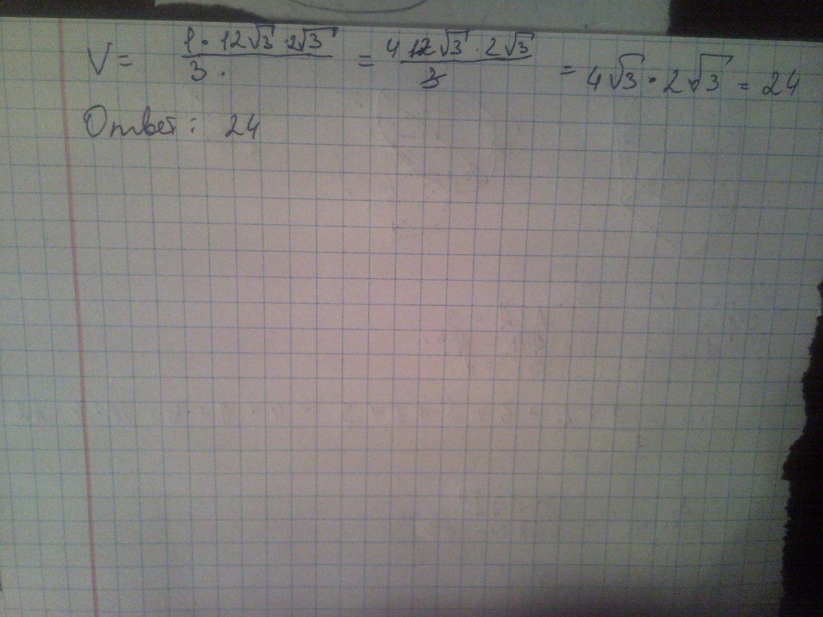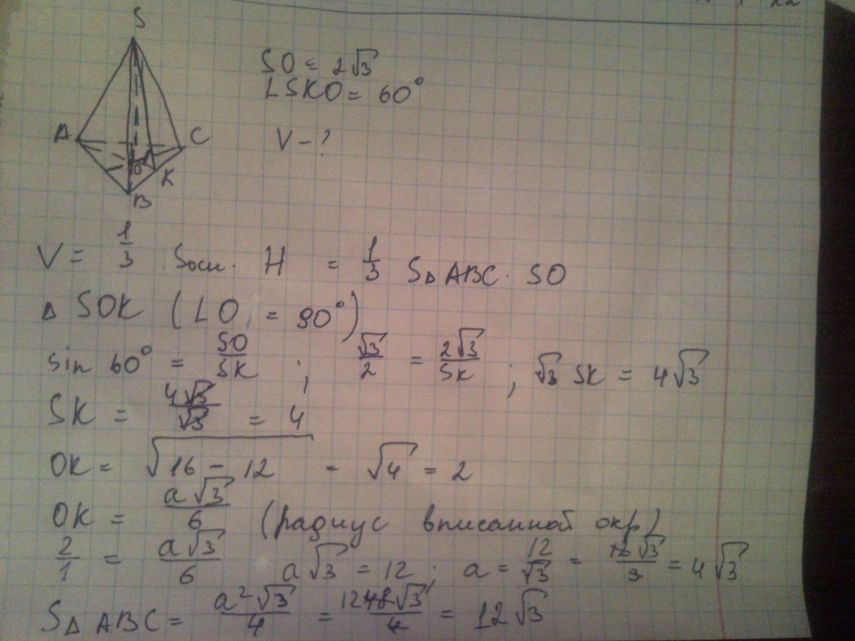 в правильной треугольной пирамиде сторона основания равна 3 корня из 2, а плоский угол при вершине равен 60 градусов найти объем пирамиды