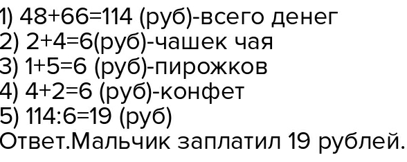 Школьном буфете Две чашки чая, один пирожок и четыре конфеты стоят 48 руб., а 4 чашки чая, 5 пирожков и 2 конфеты тире 66 руб.. Сколько рублей заплатит мальчик за покупку одной чашки чая, 1 пирожка и 1 конфеты?