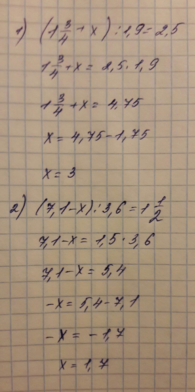 Решите уравнение: пожалуста помогите срочно нужно: (1 целая 3/4 +х):1,9=2,5. 2) (7,1-х):3,6=1 целая 1/2