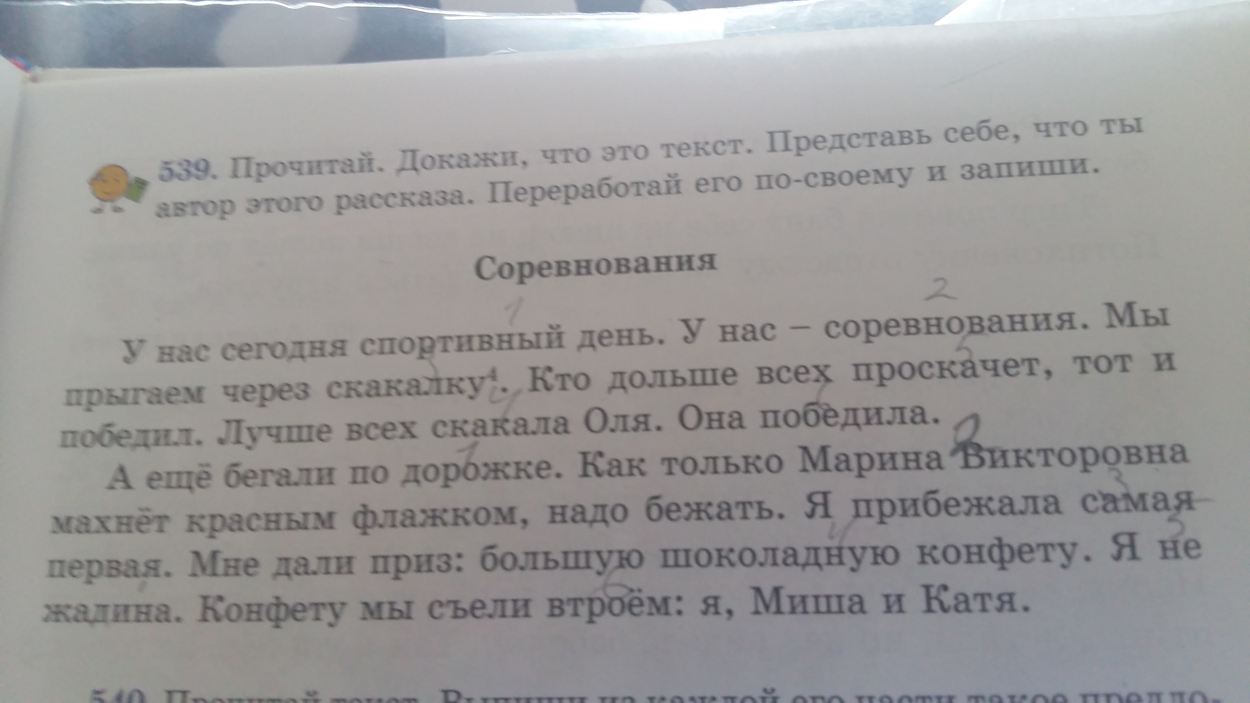 Сегодня у нас были спортивные соревнования. Очень многие ребята приняли участие. Одно из самых запоминающихся испытаний были прыжки через скакалку. Лучше всех прыгала Оля, она и победила.