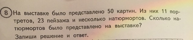 1) 50 - 11 - 23 = 16 натюрмортов - было представлено на выставке.