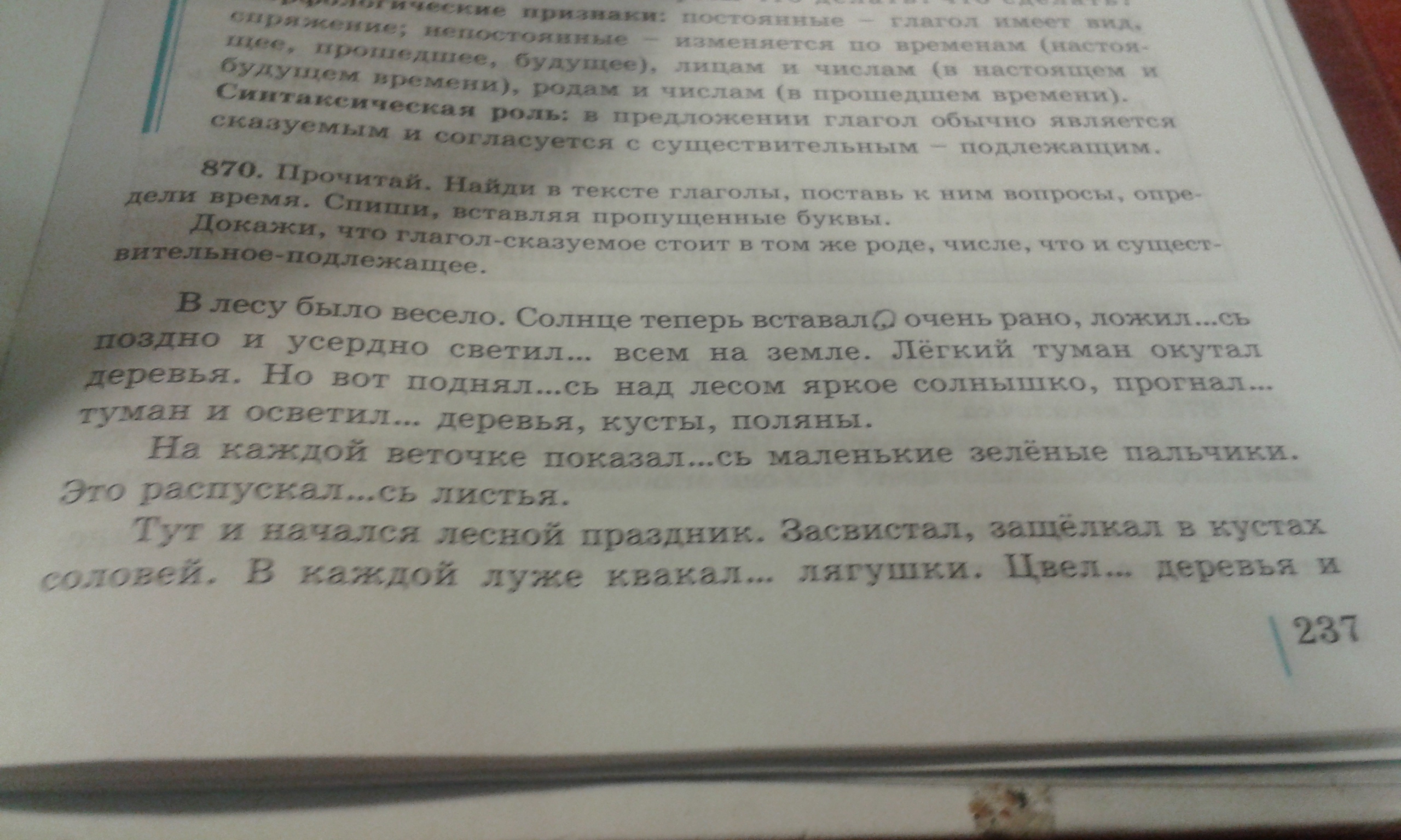 в лесу было весело. солнце теперь вставалО очень рано, ложилОсь поздно и усердно светилО всем на земле. лёгкий туман окутал деревья. но вот поднялОсь над лесом яркое солнышко, прогналО туман и осветилО деревья, кусты, поляны.