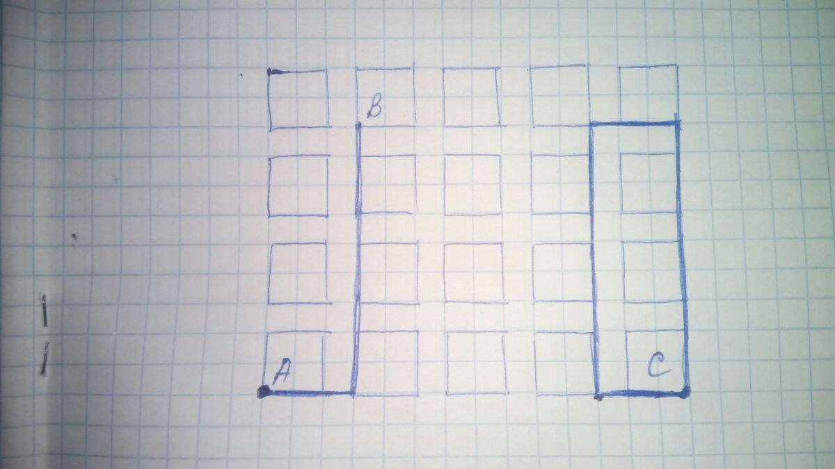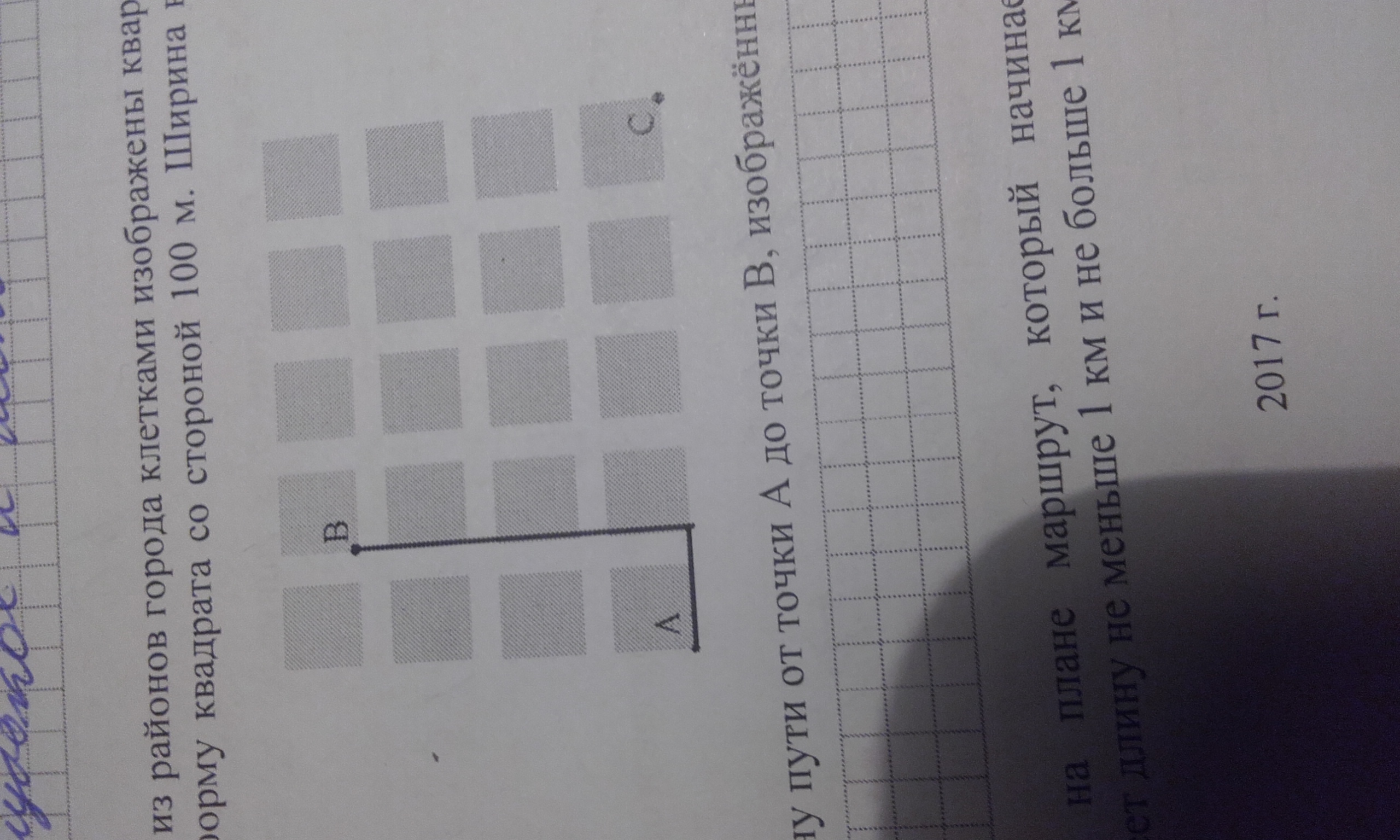 на плане одного из раенов города клетками изображены кварталы, каждый из которых имеет форму квадрата со стороной 100 м. Ширина всех улиц в этом раене-30 м. 1) Найдите длину пути от точки А до точки В, изображенных на плане. 2) Изобразите на плане маршрут, который начинается и заканчивается в точке С и имеет длину не меньше 1 км и не больше 1 км 200 м.