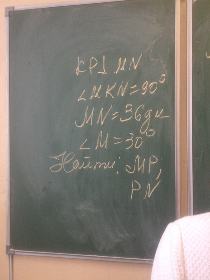 Т. к. <М=30,то МК=1/2МN=36/2=18. По теореме о перпендикуляре опушенном из вершины прямого угла NP=NK^2/MN=18*18/36=9. тогда РМ=36-9=27