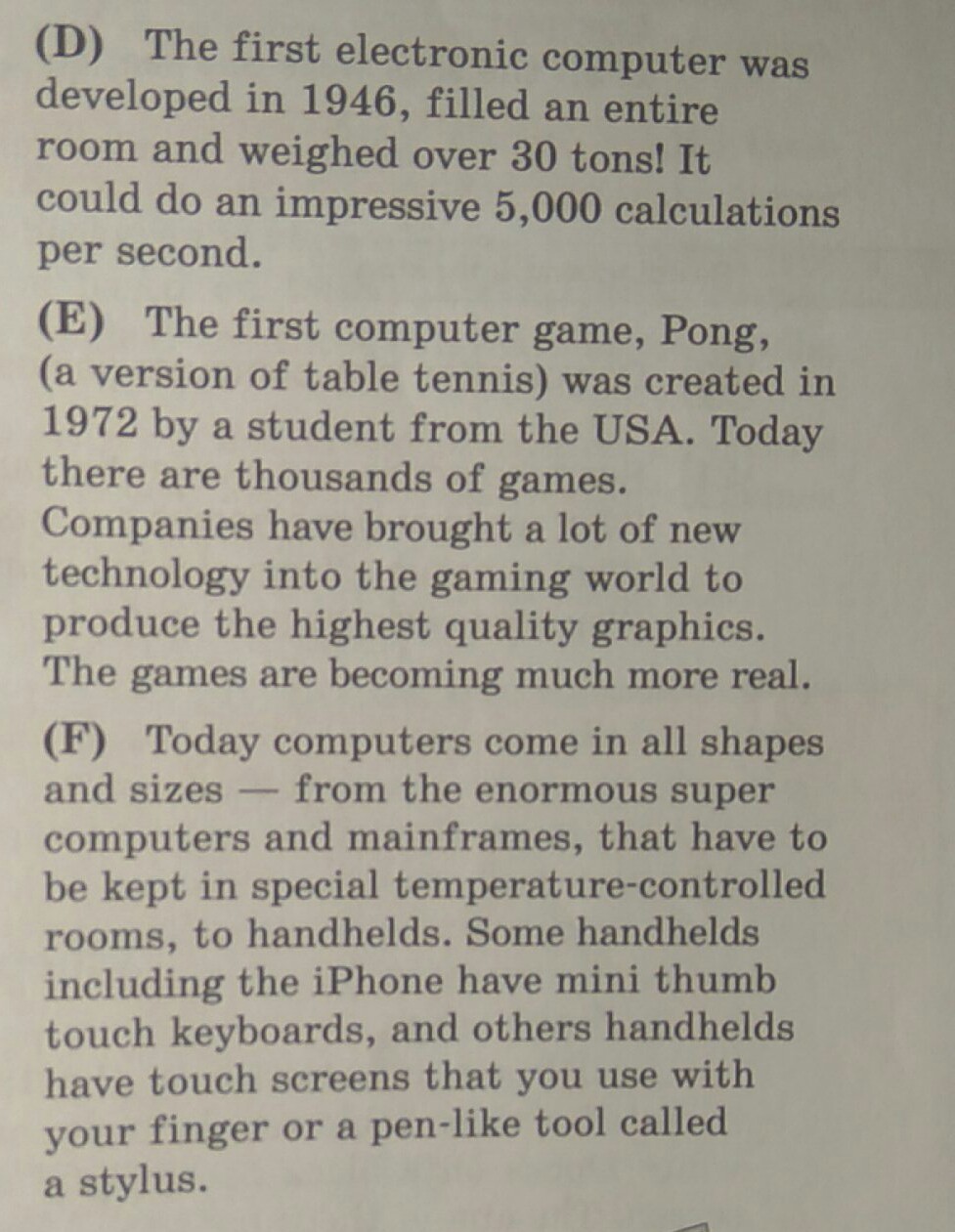 (d) Первый электронный компьютер был изобретен в 1946, заполнил всю комнату и весил около 30 тонн! Он мог делать около 5000 расчетов в секунду!