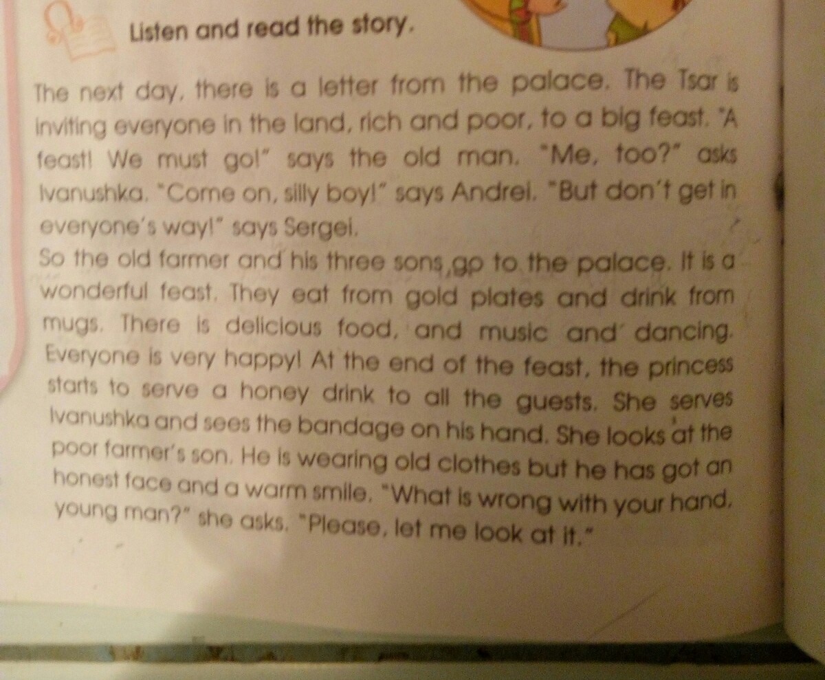 Слушайте и читайте рассказ. На следующий день, есть письмо из дворца. Царь приглашает всех на землю, богатых и бедных. На большой праздник. Пир Нам нужно сказать, старик, я тоже? - спрашивает Иванушка. «Пойдем, глупый мальчик скажет Андрею». Но не попадайся на всех, говорит Сергей. И вот, старый бывший три сына и сын во дворце. Это замечательный праздник. Они едят из золотых тарелок и пьют из кружек. Есть вкусная еда, и музыка, и танцы. Все очень счастливы! В конце праздника, принцесса начинает подавать медовый напиток всем гостям, она служит и на его руке. Она смотрит на бедного бывшего сына. Он одет в старую одежду, но у него честное лицо и теплая улыбка. «Что случилось с твоей рукой, молодой человек?» Она спрашивает: «Пожалуйста, позвольте мне взглянуть на него.
