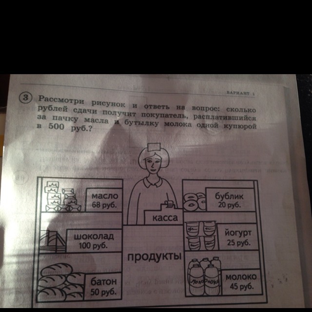 Рассмотри рисунок и ответь на вопрос сколько рублей сдачи получит покупатель расплатившийся за пачку масло и бутылку молока одной купюрой в 500руб?