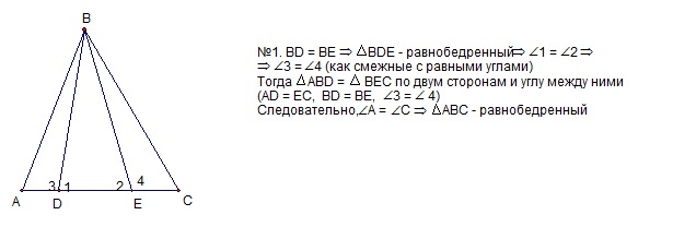 1)на стороне ас треугольника авс выбраны точки д и е так что ад се. оказалось что отрезки вд и ве тоже равны. докажите что треугольник авс равнобедренный