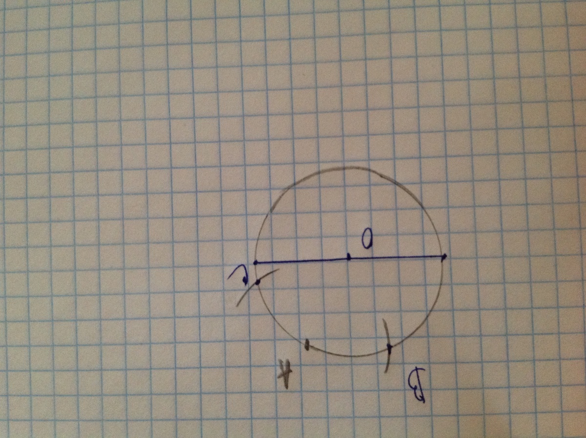 разложи циркуль на 1см5мм, с точки А сделай две засечки, чтоб пересекались с окружностью.