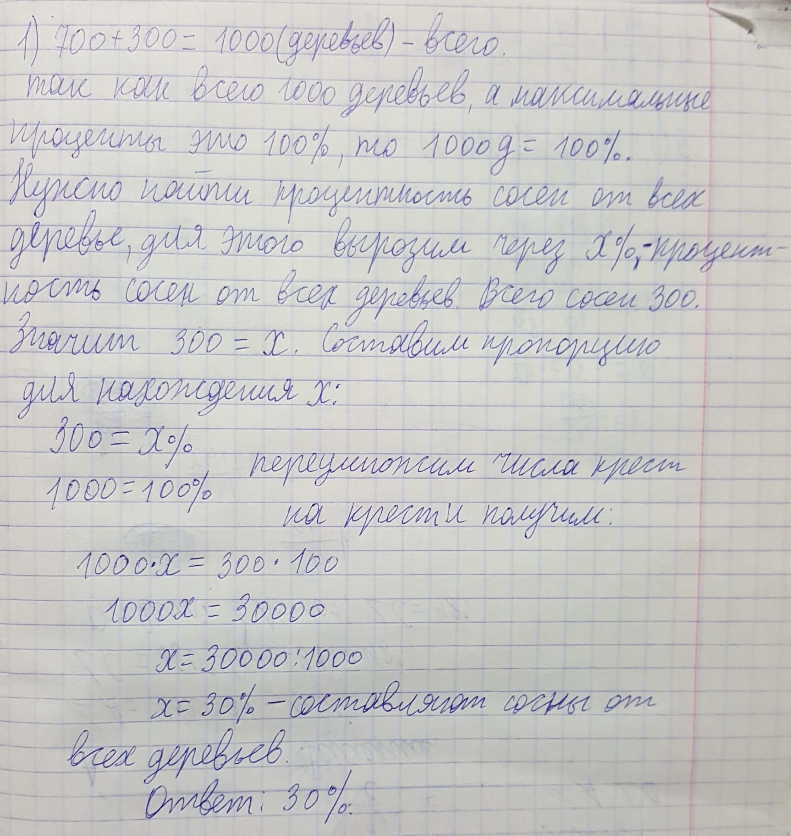В роще было 700 берёз и 300 сосен. Сколько процентов всех деревьев составляют сосны? Желательно действиями и с пояснениями