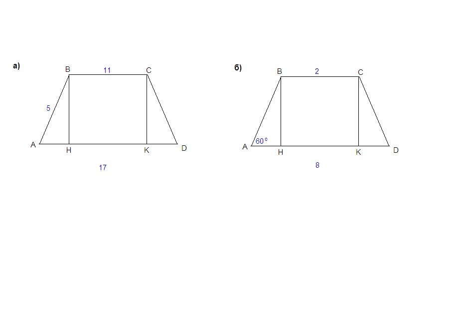 найдите площадь равнобедренной трапеции если а) ее основания и боковая сторона соответственно равны 11 см, 17см и 5 см б) известны ее основания 8 см , 2 см и угол 60 градусов