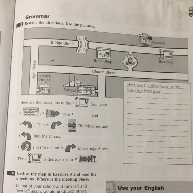 School to the right your and left. Then right Church Street and left into the Circus. A circle the Circus and left into Bridge Street. The Bus Stop is there, on your( прости, это все что я смогла)