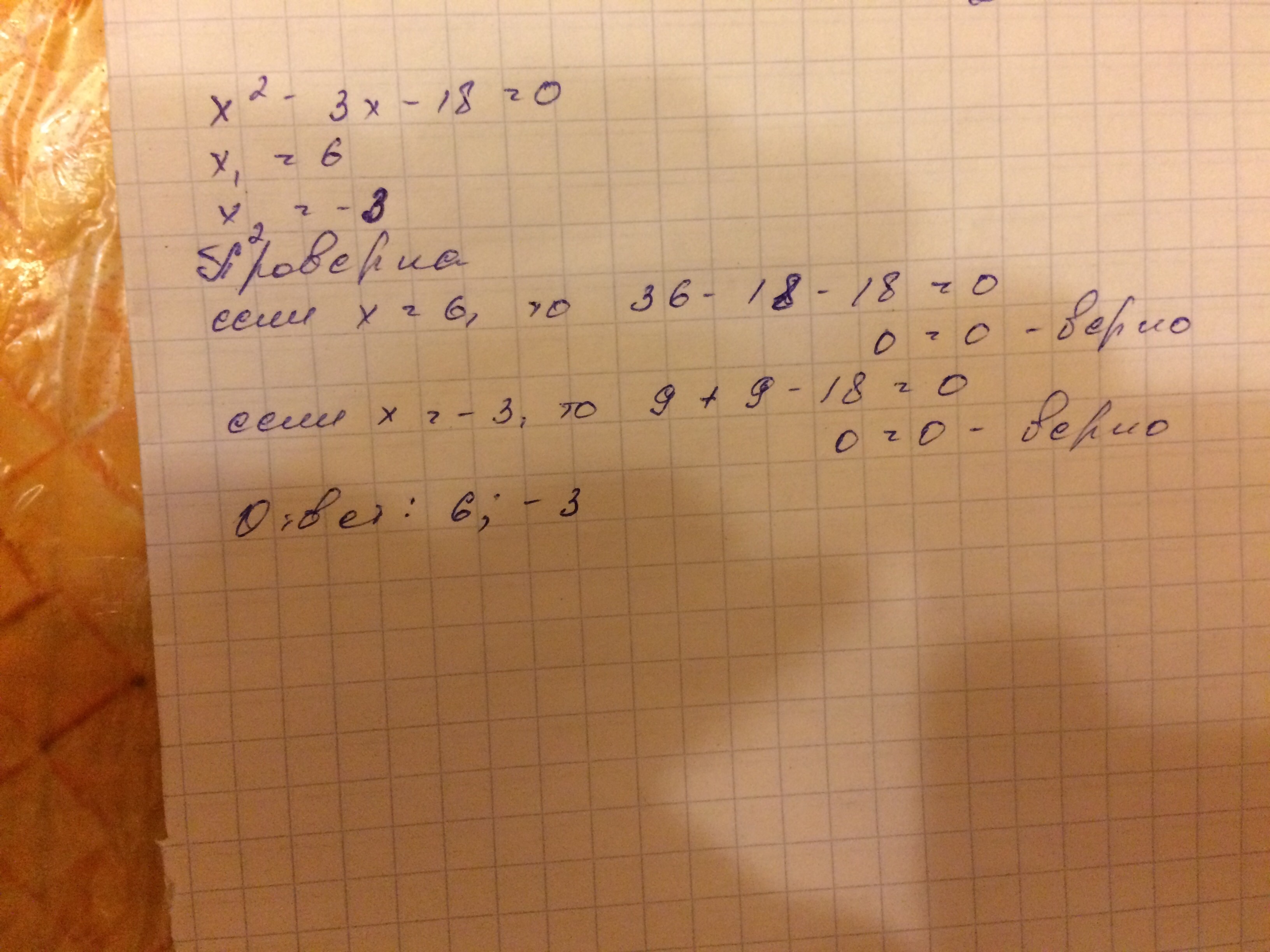 2) x^2 - 3x - 18 = 0