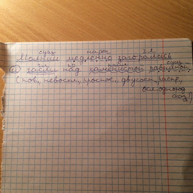 Синтаксический разбор предложения "Молнии медленно загорались и гасли над каменистой равниною."