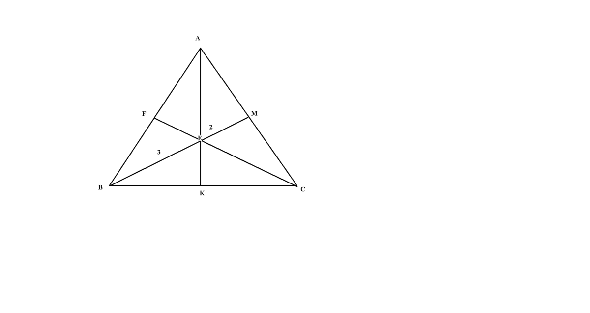 Проведем еще один отрезок с вершины C - CF. Так чтобы он отрезок проходил через точку Е, по теореме Чевы ,