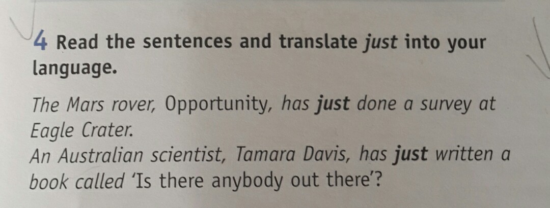 Прочитайте предложения и переведите только на русский язык.На Марсе марсоход "Оппортьюнити" только что сделал опрос в Орел кратерАвстралийский ученый, Тамара Дэвис,только что написал книгу под названием есть там кто-нибудь?
