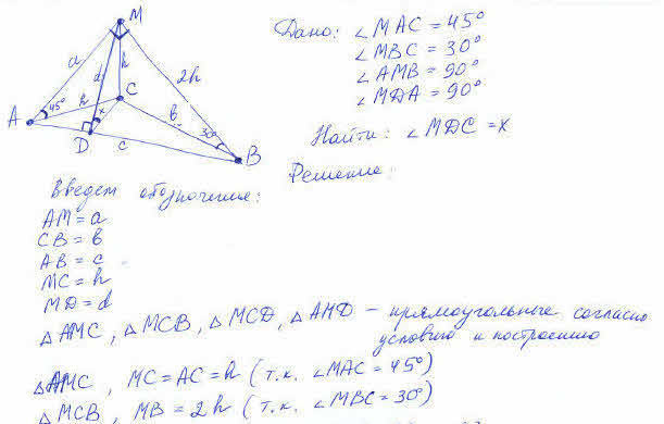 Из точки м к плоскости а проведены две наклонные, образующие с этой плоскостью углы 30 и 45, а между собой 90. Из точки м опущен перпендикуляр на прямую, проведенную через основания наклонных.Какой угол с плоскостью а образует этот перпендикуляр?