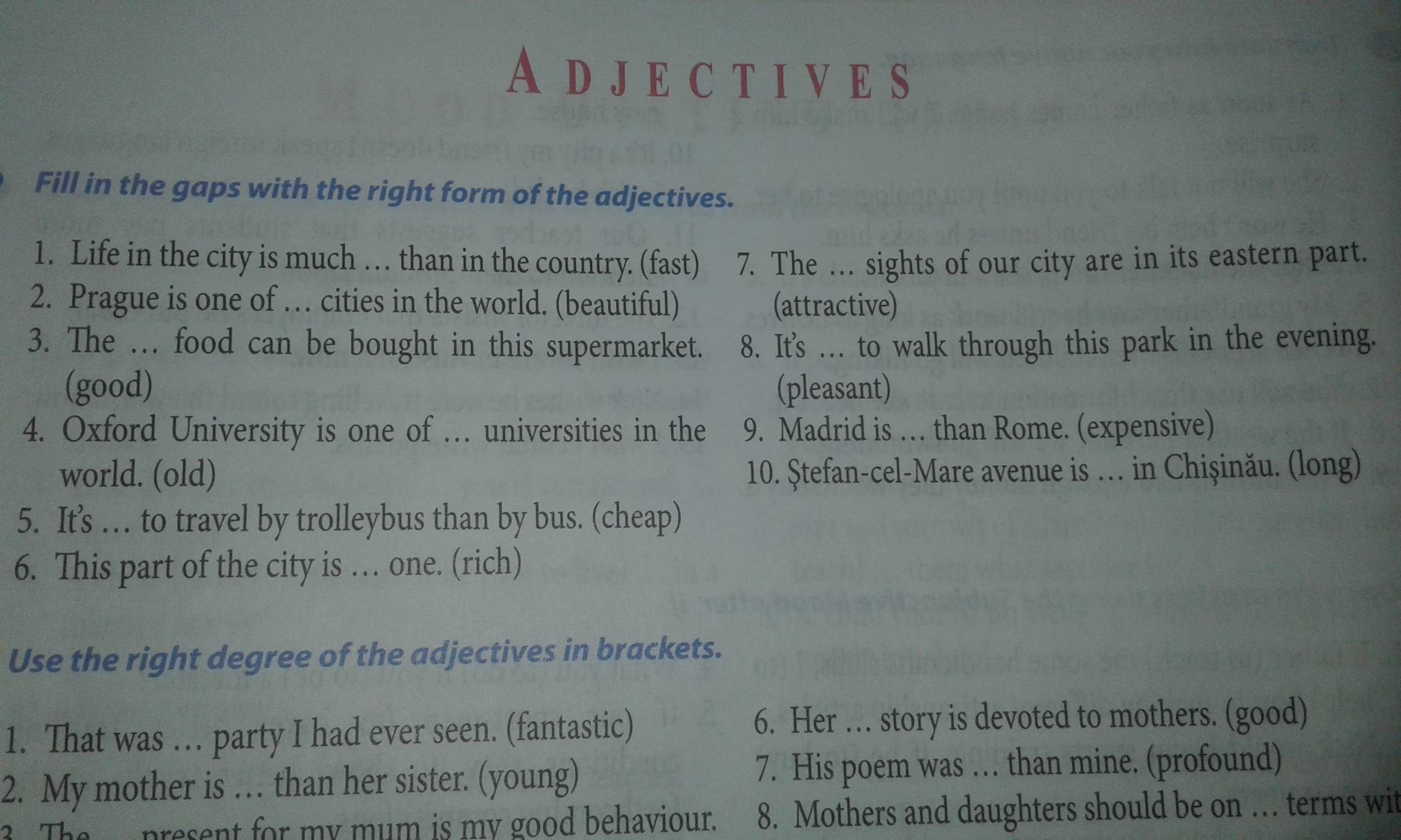 1. faster 2. the most beautiul 3. best 4. oldest 5. cheaper 6. the richest 7. most attractive 8. more pleasant 9. more expensive 10. the longest