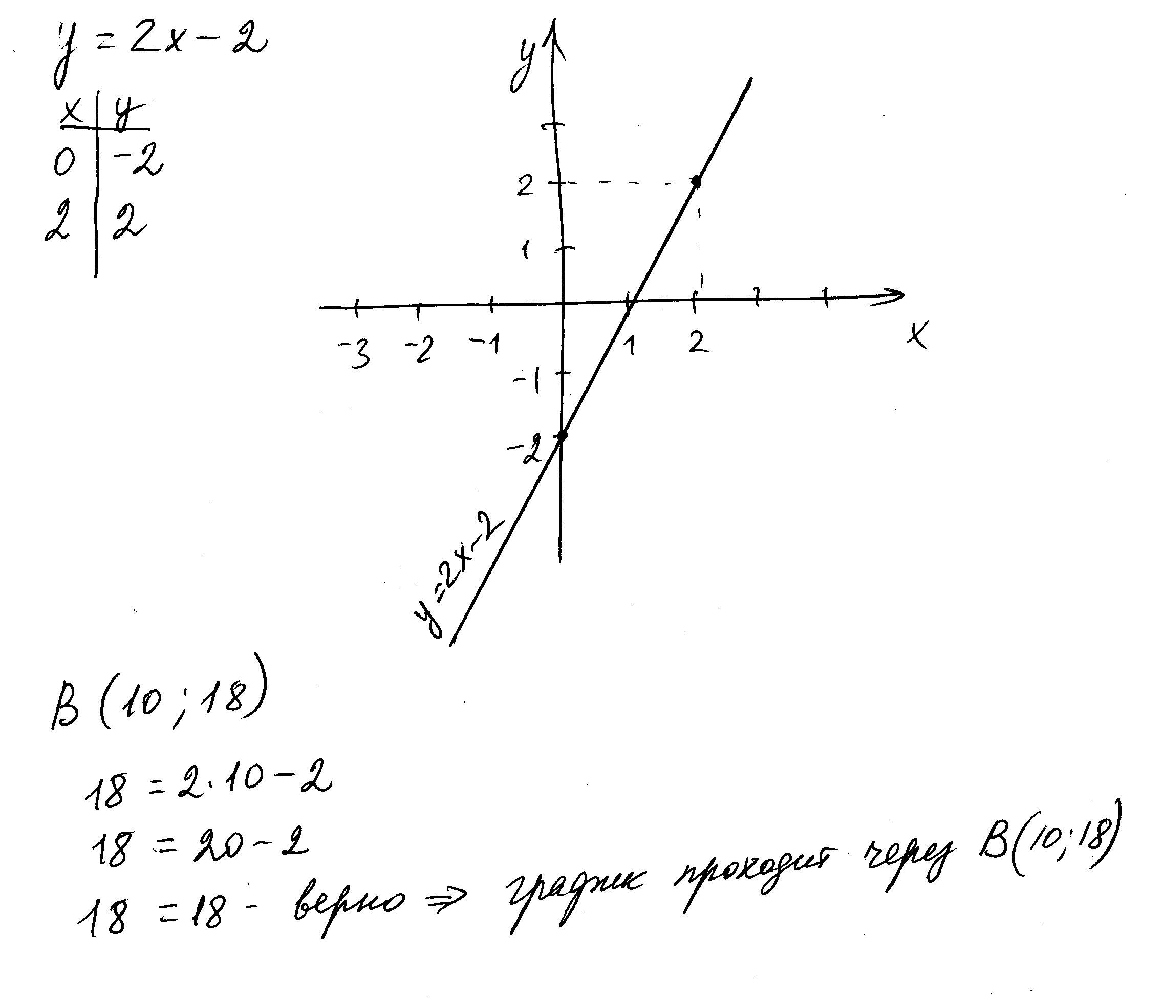 Постройте график функции y = 2x - 2. Определите проходит ли график функции через точку B(10,18) СРООООЧНО!!! ПОЖАЛУЙСТА НУЖНА ПОМОЩ!!!