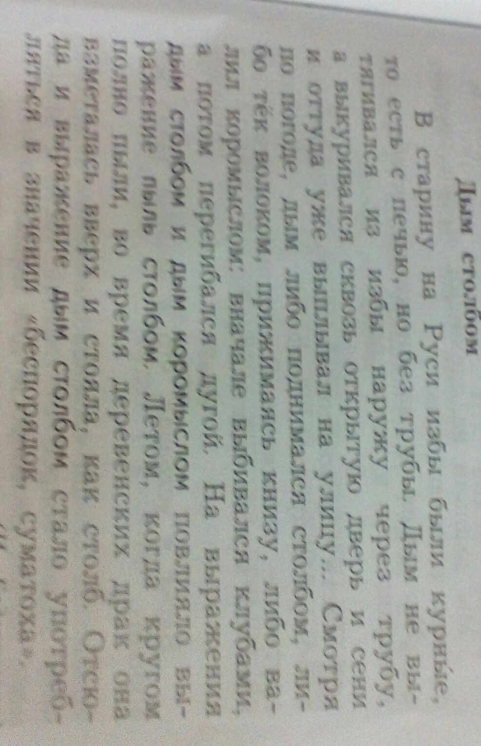 в(предлог) старину(сущ.) на(предл.) Руси(сущ.) избы(сущ.) были(глагол) курные(прилагательное), то есть(союз) с(предлог) печью(сущ.), но(союз) без(предлог) трубы(сущ.). Дым(сущ.) не(частица) вытягивался(глагол) из(предлог) избы(сущ.) наружу(наречие) через(наречие, союз или предлог) трубу(сущ.), а(союз) выкуривался(глагол) сквозь(наречие) открытую(прил.) дверь(сущ.) и(союз) сени(сущ.) и(союз) оттуда(наречие) уже(частица) выплывал(глагол) на(предл) улицу(сущ.).... Смотря(это может быть деепричастие(если вы его проходили), либо если не проходили, то глагол) по(предлог) погоде(сущ.), дым(сущ.) либо(союз) поднимался(глагол) столбом(сущ. или наречие), либо(союз) тек(глагол) волоком(сущ. или наречие), прижимаясь(деепричастие( если опять же вы ешопроходили, а если нет, то глагол) к(предлог) низу(наречие), либо(союз) валил(глагол) коромыслом(сущ.): вначале(наречие) выбивался(глагол) клубами(сущ. или наречие), а(союз) потом(наречие) перегибался(глагол) дугой(сущ. или наречие). На(предлог) выражения(сущ.) дым(сущ.) столбом(сущ. или наречие) и(союз) дым(сущ.) коромыслом(сущ. или наречие) повлияло(глагол или деепричачтие) выражение(сущ.) пыль(сущ.) столбом(сущ. или причастие). Летом(сущ.), когда(наречие) кругом(сущ. или наречие) полно(наречие) пыли(сущ.), во(предлог) время(сущ.) деревенских(прилагательное) драк(сущ.) она(местоимение) взметалась(глагол) вверх(причастие) и(союз) стояла(глагол), как(наречие) столб(сущ.).Отсюда(наречие) и(союз) выражение(сущ.) дым(сущ.) столбом(сущ. или наречие) стало(глагол) употребляться(глагол) в(предлог) значении(сущ.) "беспорядок(сущ.), суматоха(сущ.).