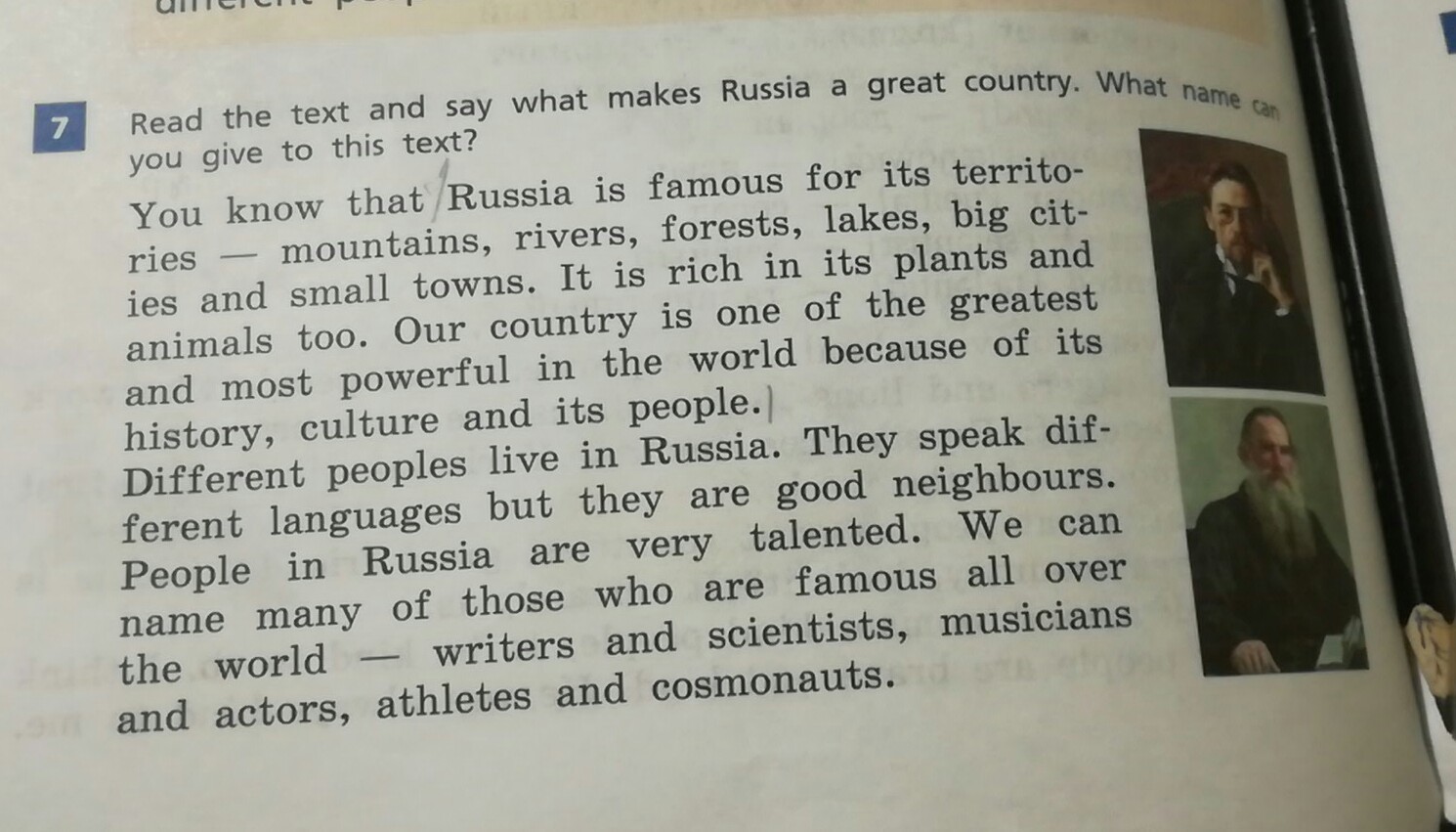 Ты знаешь, что Россия знаменита своими территориями - горами, реками, лесами, озёрами, городами(большие) и маленькими городками. Она богата различными растениями и животными. Наша страна одна из самых великих и самых мощных из-за ее истории, культуры и людей. Разниц люди живут в России. Они говорят на разных языках, но они хорошие соседи. Русский народ очень талантлив. Мы можем назвать много наших людей известных во всем мире - писатели, ученые, музыканты, атлеты и космонавты