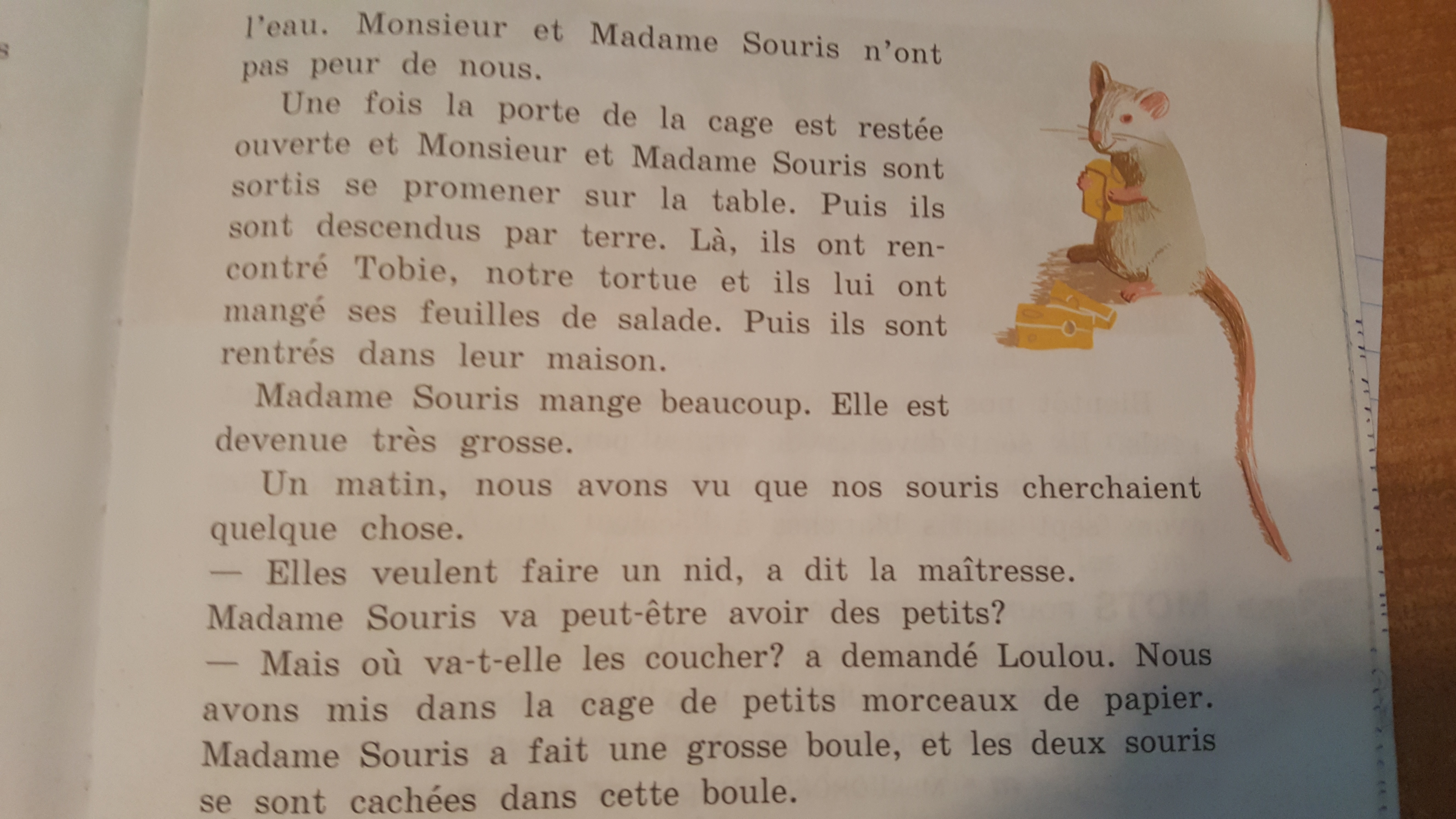 Однажды дверца клетки осталась открытой, и Месье и Мадам Мыши вышли прогуляться по столу. Затем они спустились на пол. Там они повстречали Тоби, нашу черепаху, и съели его листья салата. Потом они вернулись в свой домик.