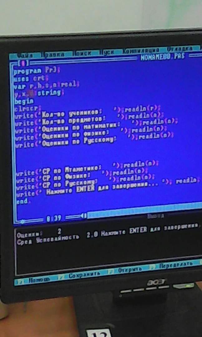 Writeln('Порядок ввода оценок: физика, математика, русский');