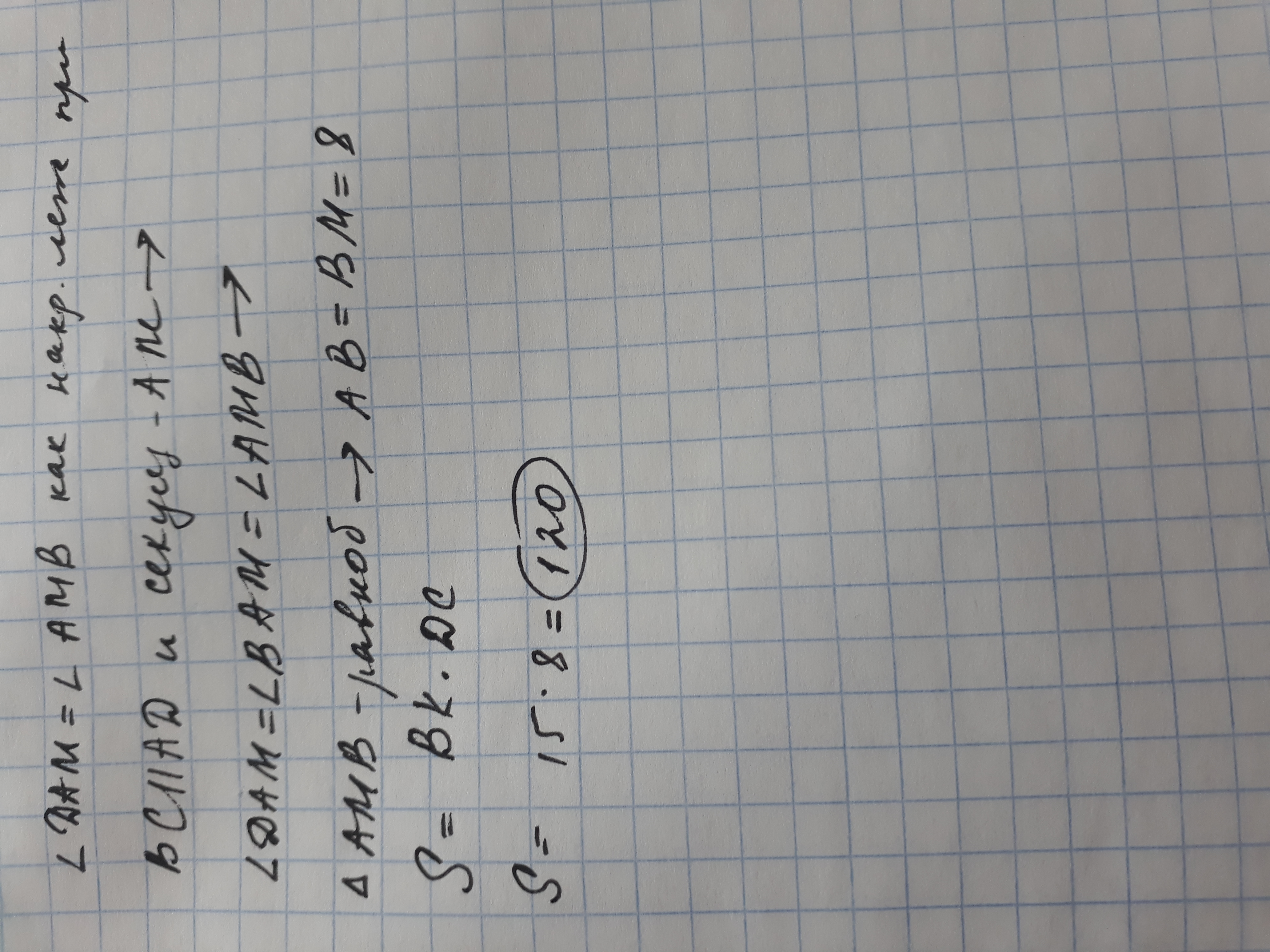 В параллелограмме ABC биссектриса AM угла A делит сторону BC на две части. Найдите площадь параллнлограмма, если BM=8 см и расстояние от вершины B до стороны CD равно 15 см