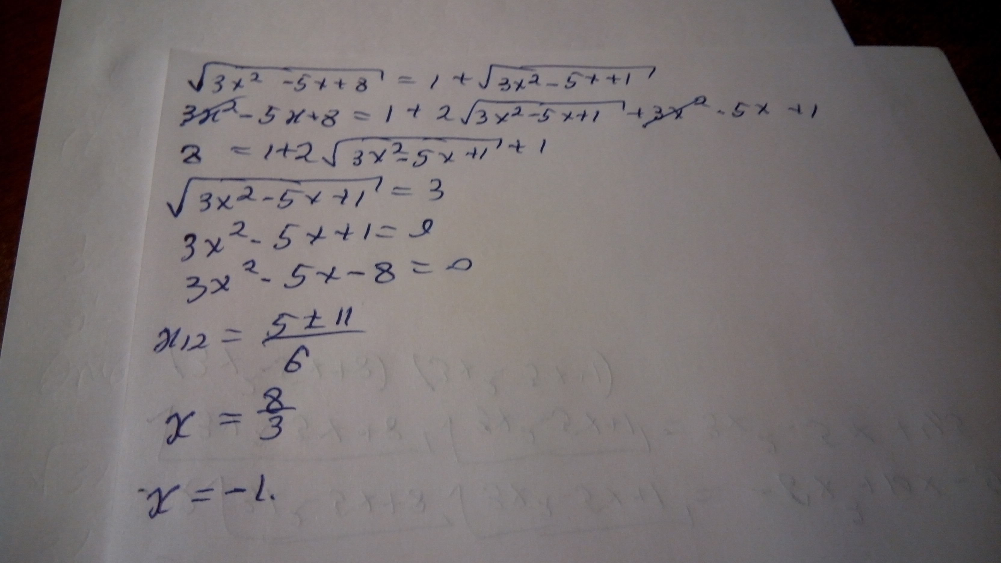 √(3x²-5x+8)=1+√(3x²-5x+1)