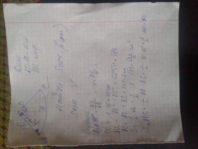 тогда можно найти высоту конуса H (у тебя это ВО)= 10*(2^(1/2)) BO=AO=10*(2^(1/2))