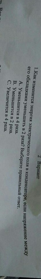 Как измениться энергия электрического поля в конденсаторе, если напряжение между его обкладками уменьшить в 2 раза
