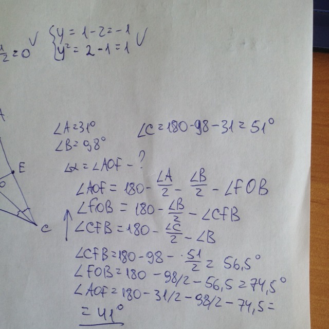 В треугольнике АВС угол А равен 31 °, угол В равен 98°, АD, ВЕ и СF- биссектрисы, пересекающиеся в точке О. Найдите угол АОF. Ответ дайте в градусах