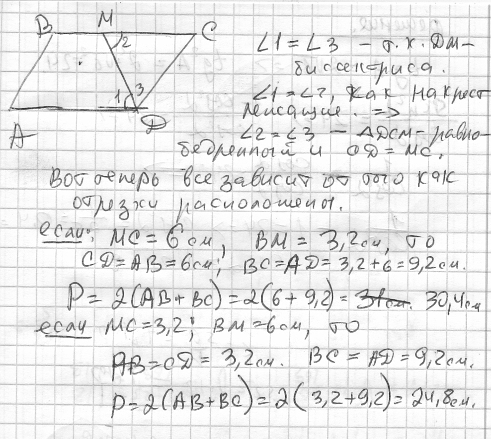 В паралелограмі ABCD Бісектриса кута D ділить сторону BC на відрізки 6 і 3.2см, знайти периметр!