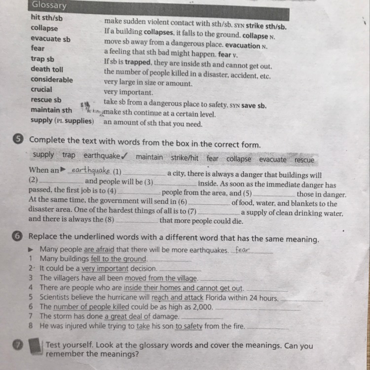 № 5 1strikes/hits 2 collapse 3trapped 4evacuate 5rescue 6supplies 7maintain 8fear №6 1collapse 2crucial 3evacuated 4trapped 5strike/hit 6death toll 7considerable 8to rescue his son from the fire