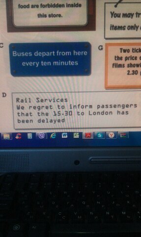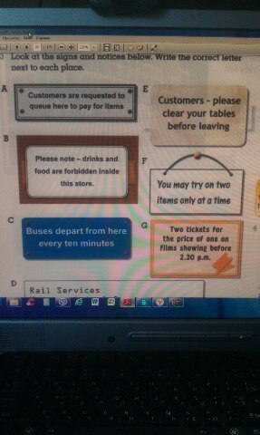 at a cash desk A; inside a fast-food restaurant E; at a bus stop C; a changing room F; on a station platform D; at a cinema G