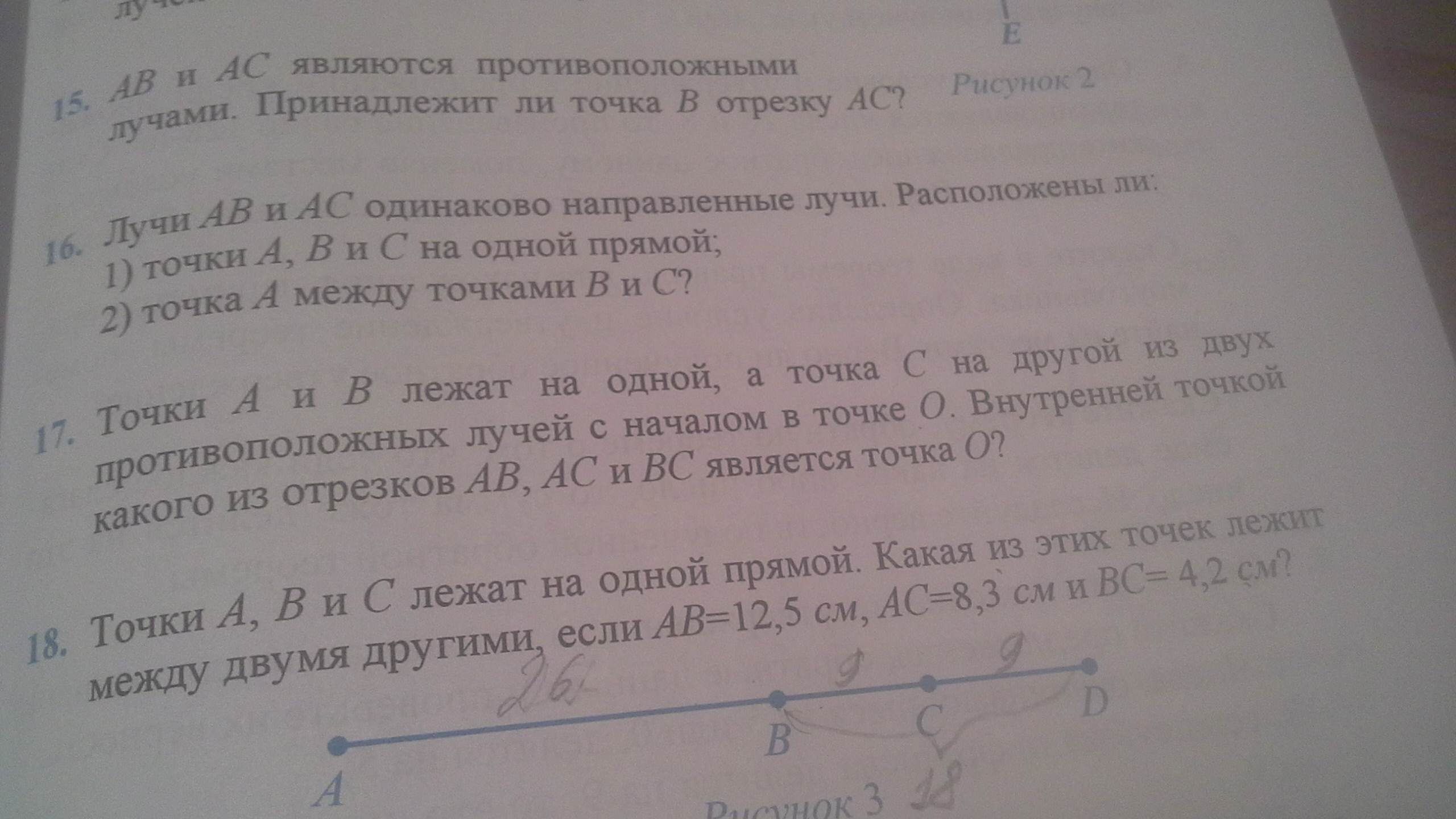 ·А и ·В лежат по одну сторону от ·О, а ·С лежит по другую сторону от ·О.