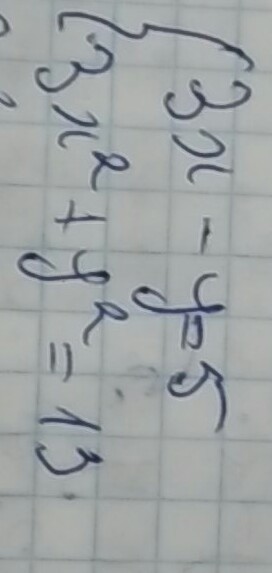 выражаем y из первого уравнения системы: y=3x-5, подставляем во второе уравнение системы: 3x^2+(3x-5)^2=13; 3x^2+9x^2-30x+25-13=0; 12x^2-30x+12=0; 2x^2-5x+2=0; D=(-5)^2-4*2*2=25-16=9; x1=(5-3)/4, x2=(5+3)/4. x1=1/2, x2=2. y1=3*1/2-5= -7/2, y2=3*2-5=1. Ответ: (1/2:-7/2), (2:1).