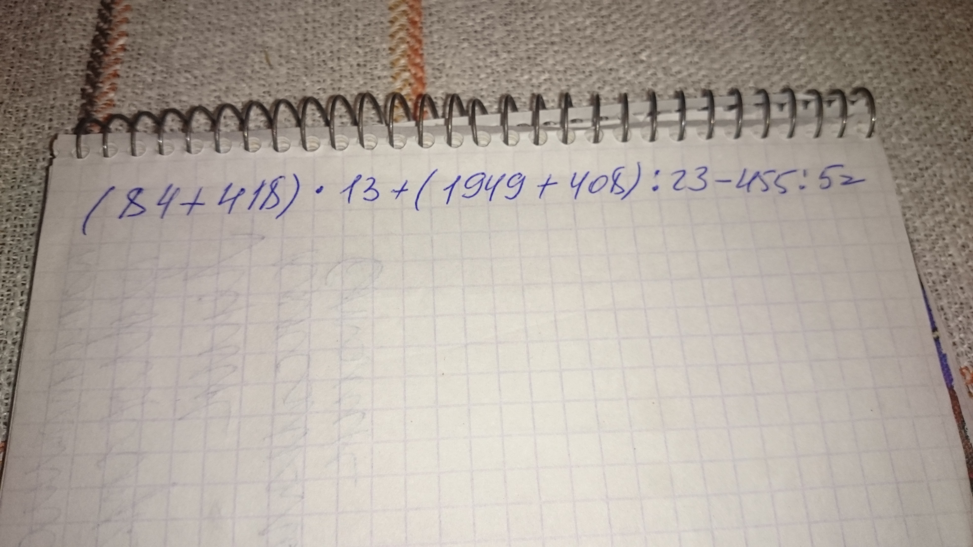 (84 + 418) * 13 + (1949 + 408) : 23 - 455 : 5 = 6537 11/23